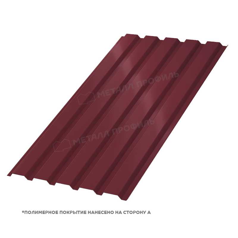 Профилированный лист МП-35х1035-B (ПЭ_Д-01-3005-0,45) представляет собой надежный строительный материал из оцинкованной стали с полимерным покрытием. Он идеально подходит для кровельных и фасадных работ, обеспечивая долговечность и эстетичный вид. Толщина металла 0,45 мм, высота профиля 35 мм, полезная ширина 1035 мм. Цвет по RAL 3005 (винно-красный) с двусторонним покрытием полиэстер. Этот материал сочетает прочность, коррозионную стойкость и простоту монтажа, делая его популярным выбором для различных конструкций.